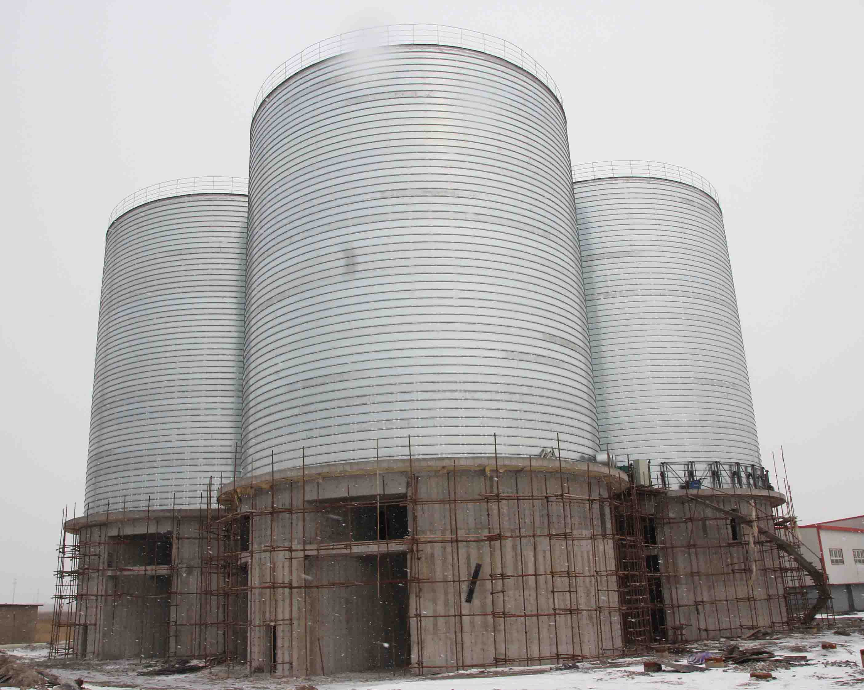 大型钢板库库顶采用网架结构,库内置抗风立柱根据钢板库高径比采用螺旋焊管或国标槽钢,直径400以上螺旋焊管内灌注混凝土,满足了钢板库水平方向的受力要求;钢板库外置环形加强筋采用国标槽钢,间距1.5米左右一环,环形加强筋的使用满足了钢板库内物料涨力的要求,也起到了库体加强作用。抗风立柱和环形加强筋形成钢板库骨架结构,充分发挥了库体的网架性能,在保证钢板库安全使用的前提下,减少钢材使用量,为客户节约了成本。欢迎广大新老客户来电咨询。